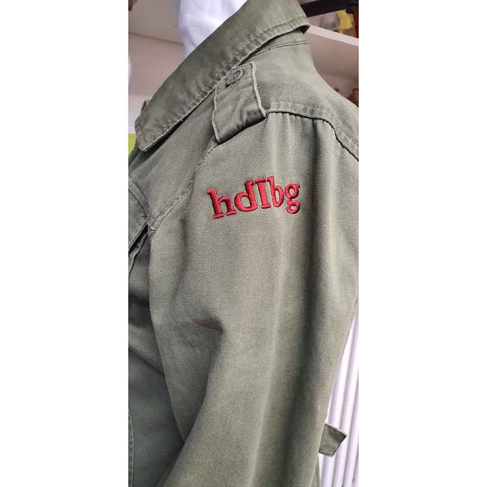 hdlbg-Stickerei auf linkem Oberarm, dunkelrot